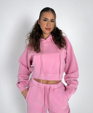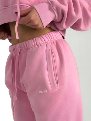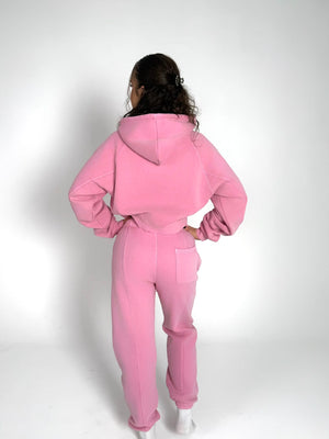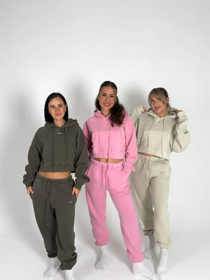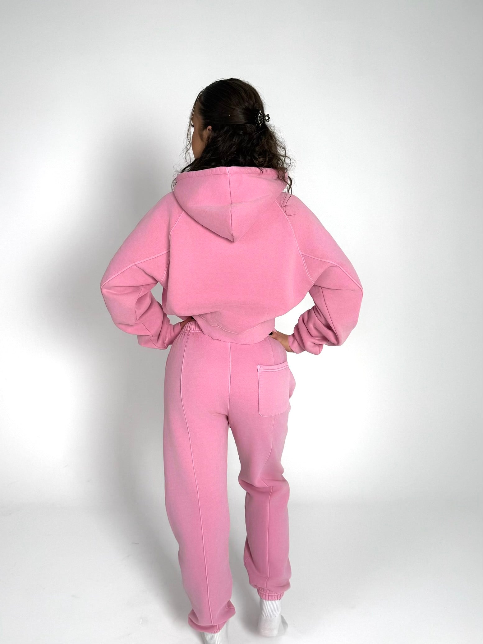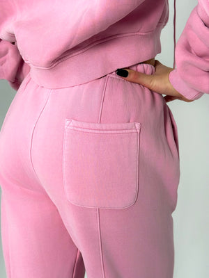 Bluza crop o oversize’owym kroju nadaje zestawowi nowoczesnego, swobodnego charakteru. Jedna praktyczna kieszeń z tyłu pozwala przechować drobne przedmioty. Spodnie z ściągaczami w kostkach zapewniają wygodne dopasowanie i podkreślają sportowy, stylowy look.